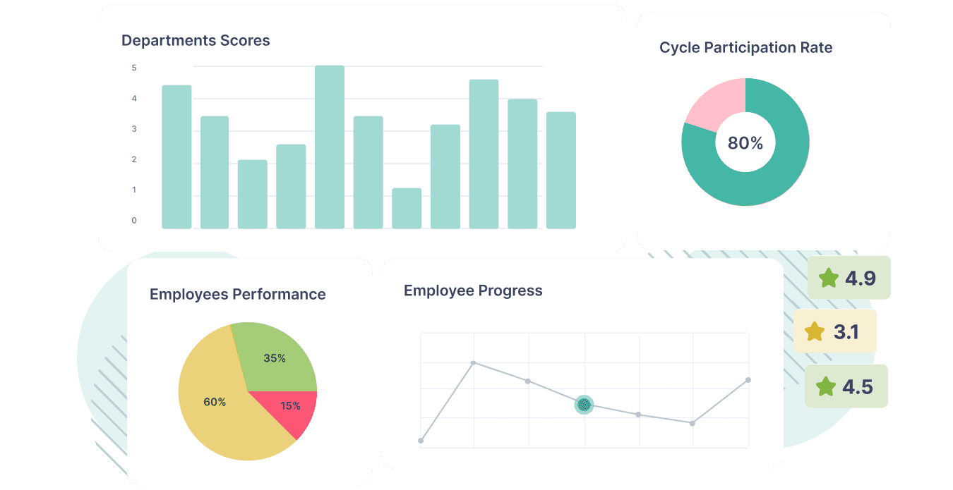 Discover multi-dimensional insights for individual, department, and team performance through our performance management analytics with comprehensive scoring. Admins can view cycles statistics (completion percentages, participation rates...etc.), enabling comparisons across teams and departments. Plus, you can track the history and performance of specific departments or teams over time, providing deeper insights into performance dynamics and allowing precise ranking of top performers.