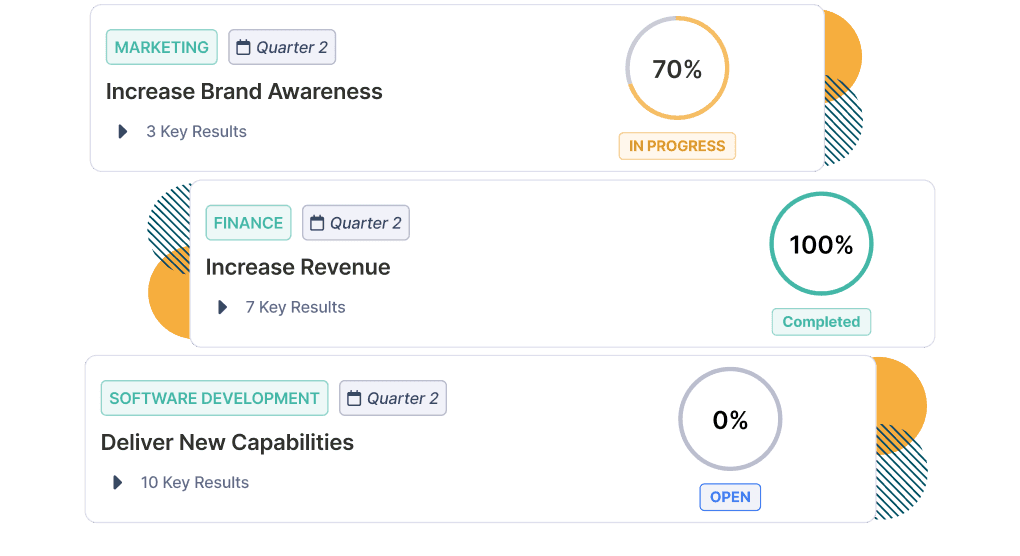 Unify your teams and employees to collaborate on common objectives and clear goals that are set at the organizational level to drive focus and performance across the entire company within a specific timeframe.
